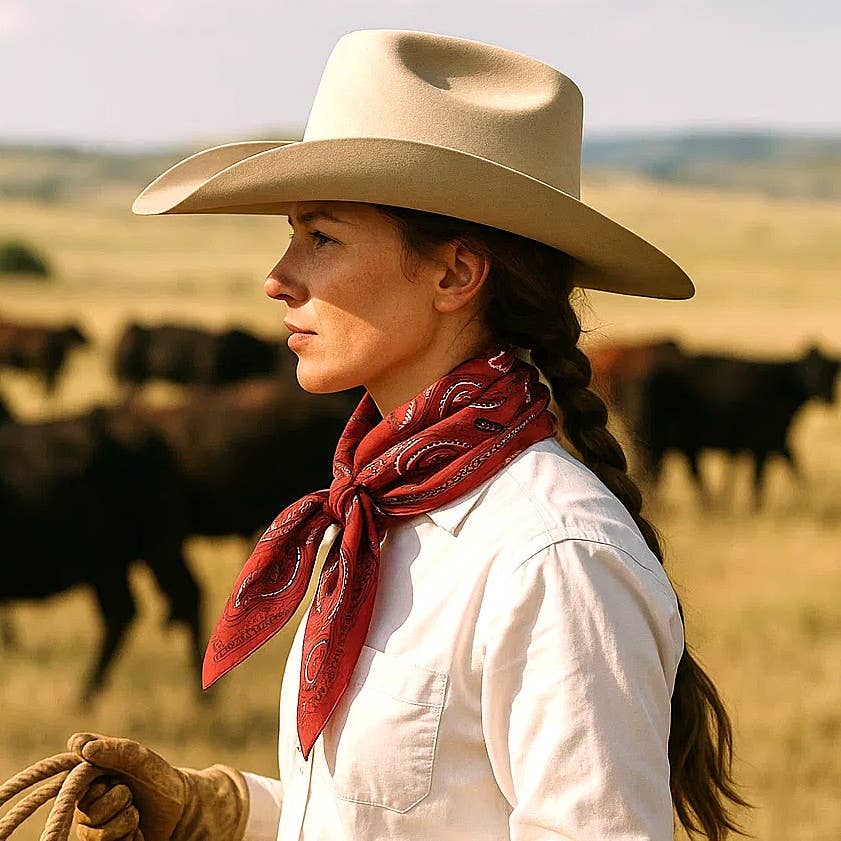 Our classic wild rag/scarf in a red and black paisley pattern.